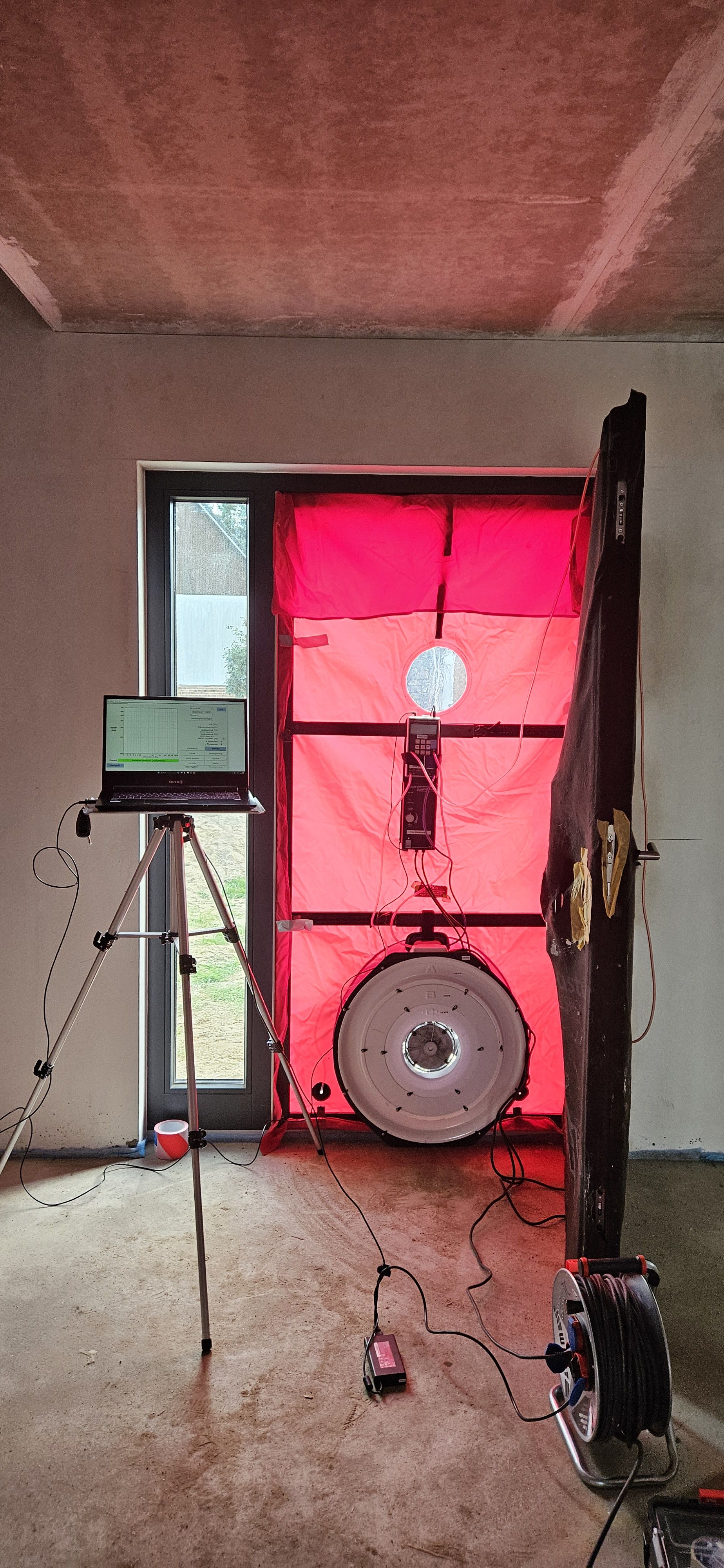 Ergänzend wurden physikalische Nachweise geprüft und erstellt, unter anderem zur Luftdichtheit des Gebäudes. Der durchgeführte Luftdichtheitstest diente dabei nicht nur der formalen Nachweisführung, sondern auch der Qualitätssicherung in der Ausführung.